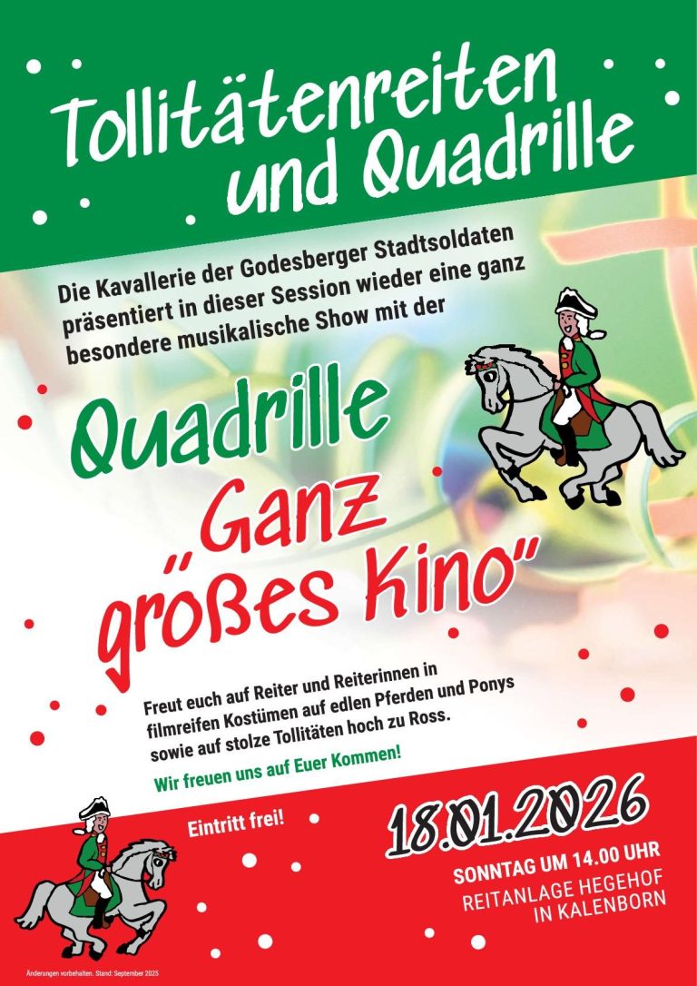 Kommt zu unserer Quadrille, lasst euch verzaubern am 18. Januar 2026 auf der Reitanlage Hegehof in Kalenborn. Der Eintritt ist frei.