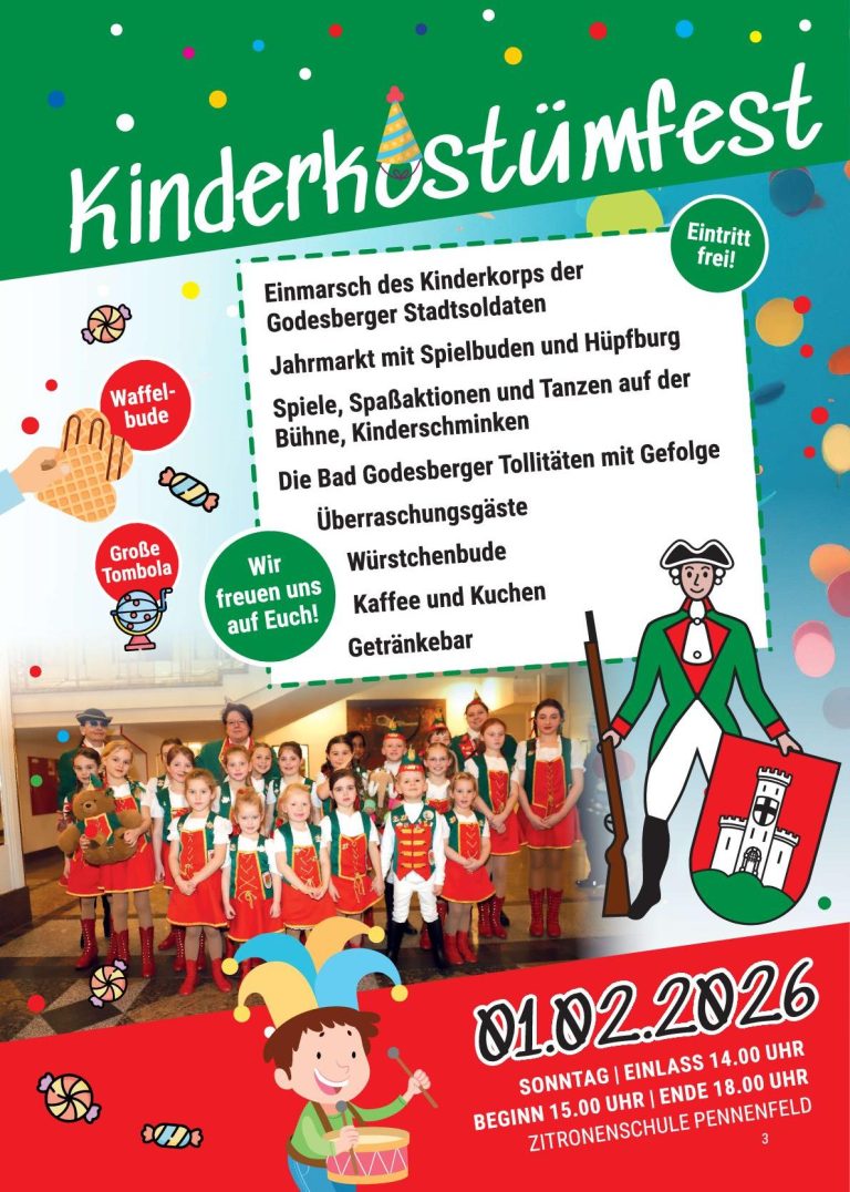 Kommt zu unserem bunten Kinderkostümfest am 01. Februar 2026 von 15:00 bis 18:00 Uhr! Seid gespannt auf das Kinderkorps der Godesberger Stadtsoldaten, einen Jahrmarkt mit Spielbuden, eine Hüpfburg, viele Spiele, Spaßaktionen und Tänze! Außerdem wird Kinderschminken angeboten, und die Bad Godesberger Tollitäten werden mit ihrem Gefolge erscheinen. Freut euch auf ganz besondere Überraschungsgäste, leckere Würstchen von der Würstchenbude und duftenden Kaffee und Kuchen. Kommt vorbei und feiert mit uns ein unvergessliches Fest!